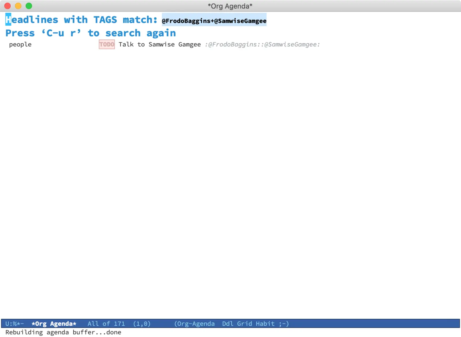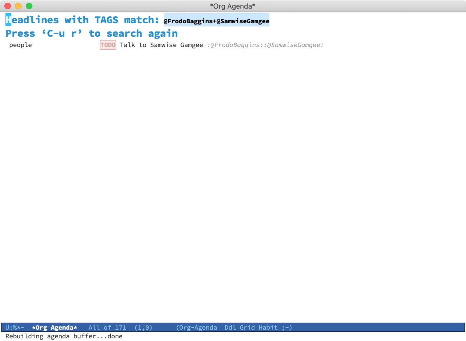 Thanks to inheritance, it's easy to find all tasks related to Frodo Baggins via org-agenda. It even enables the search of overlapping tasks. For example, tasks related to Frodo and Samwise. For more information, take a look at the matching tags and properties section of the manual.